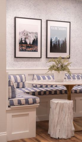 This project involved a full refresh on the main level front sitting room, formal dining area, and a cozy breakfast nook. The downstairs was completely redone with a chic updated bar and sitting area, guest powder bath, home gym & kid's basement play area.